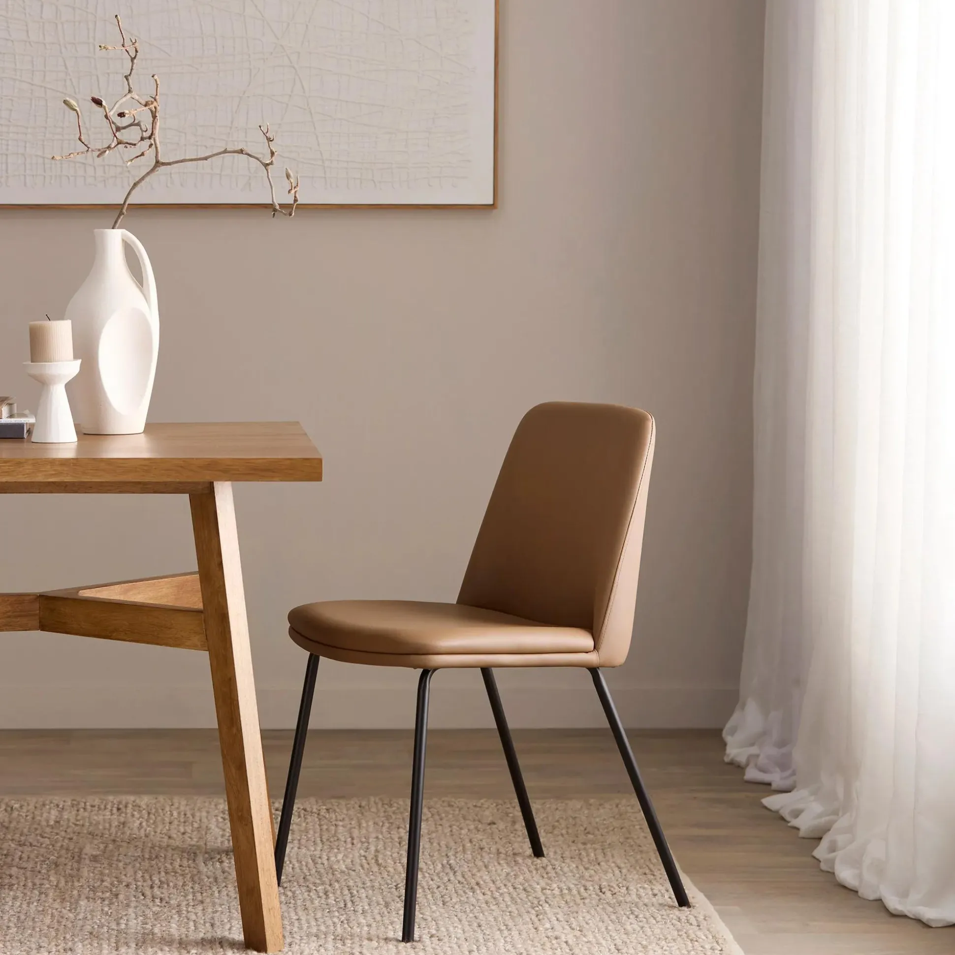 Black faux leather meets cool metal lines in this sculptural dining chair. Bold, refined, and built for long dinners and even longer compliments.