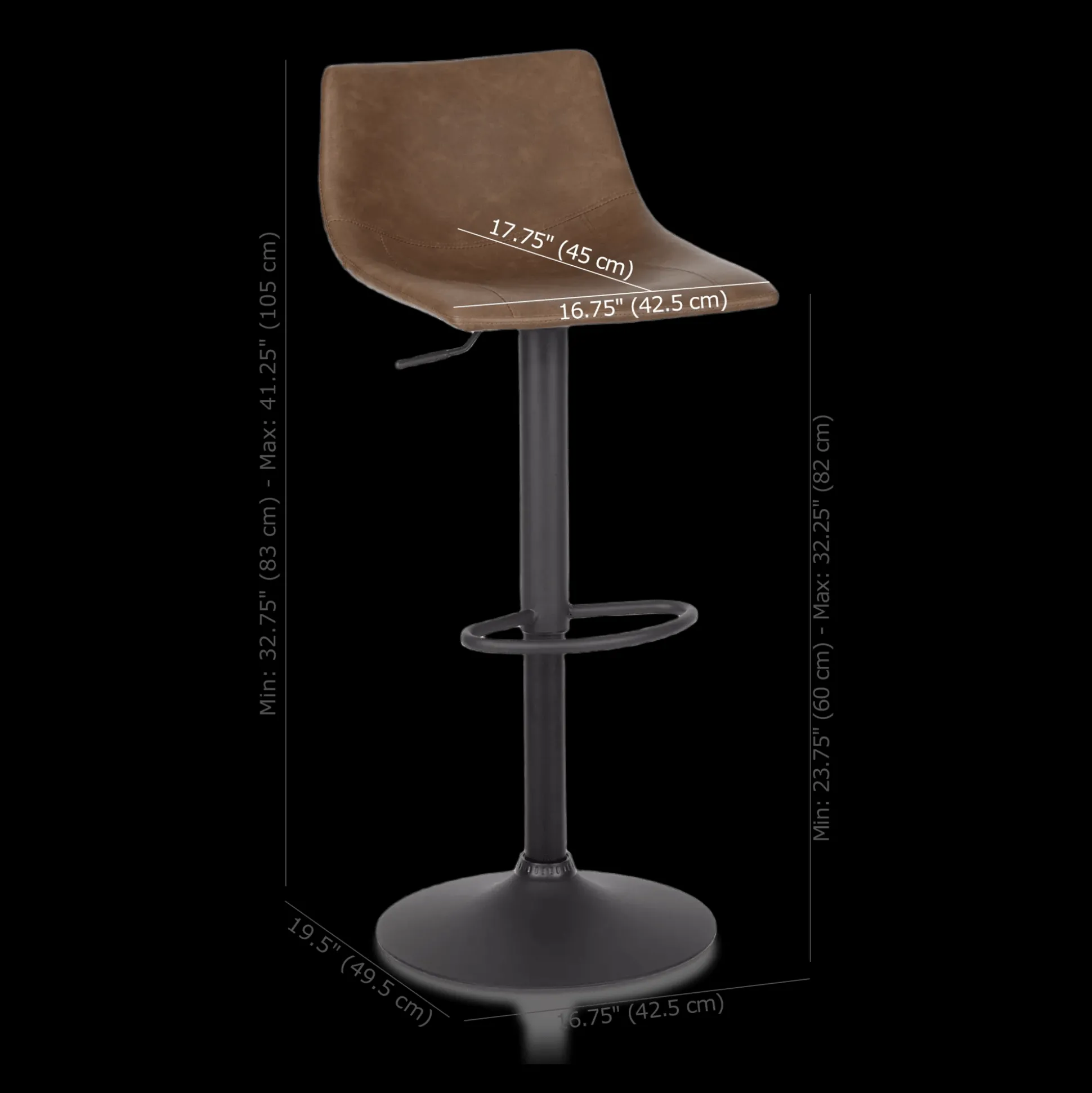 Seat to floor : 23.75 in (60.5 cm)
