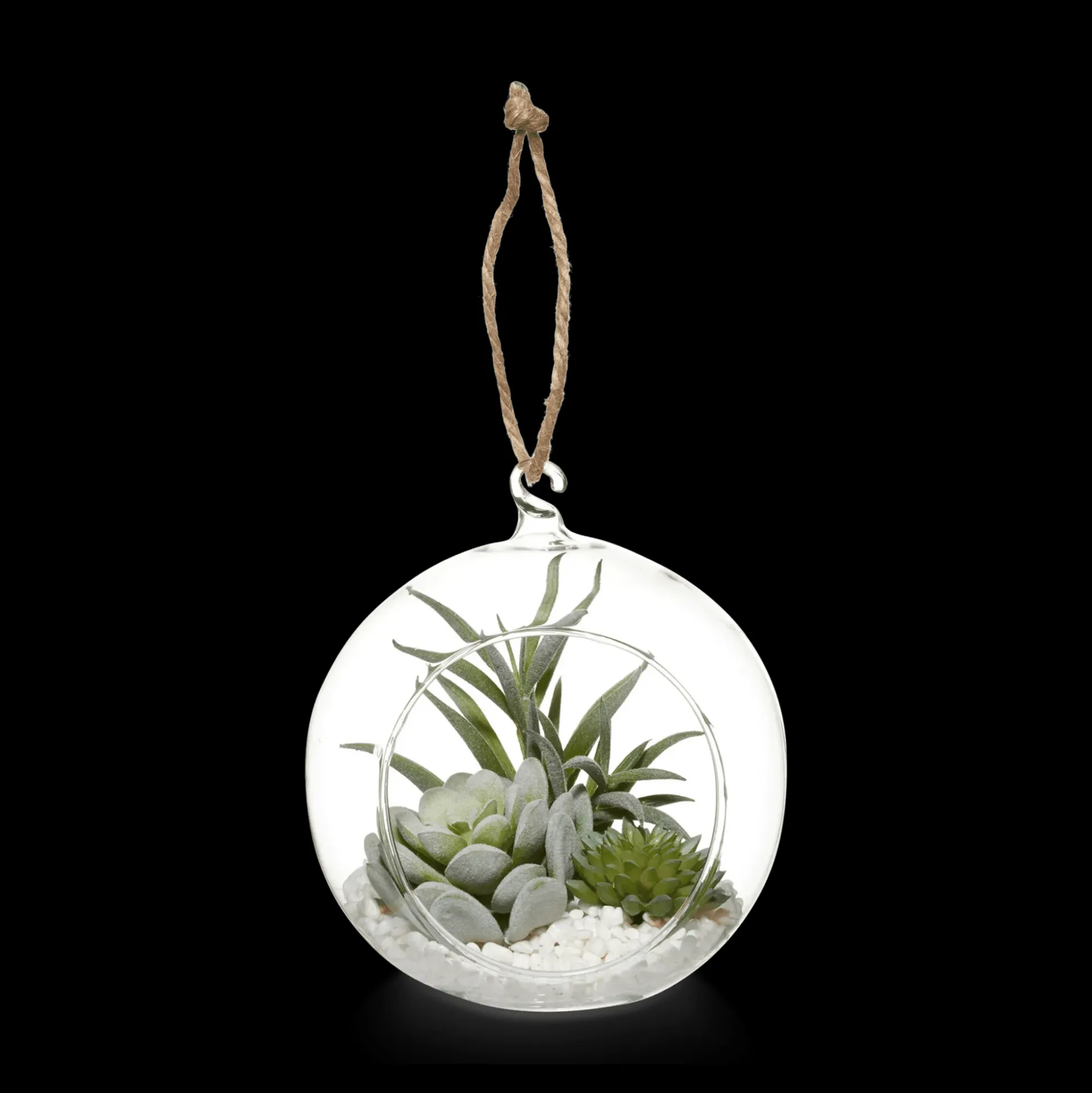 Create a living focal point in any space with this hanging terrarium. Made of clear glass with an organic-inspired form, this rope-trimmed planter has an airy and ethereal presence. Filled with pebbles and succulents, it is set to create a hip, natural vibe in your home. Hang it from the ceiling and let its combination of natural materials deliver a trendy, modern impact to your decor.