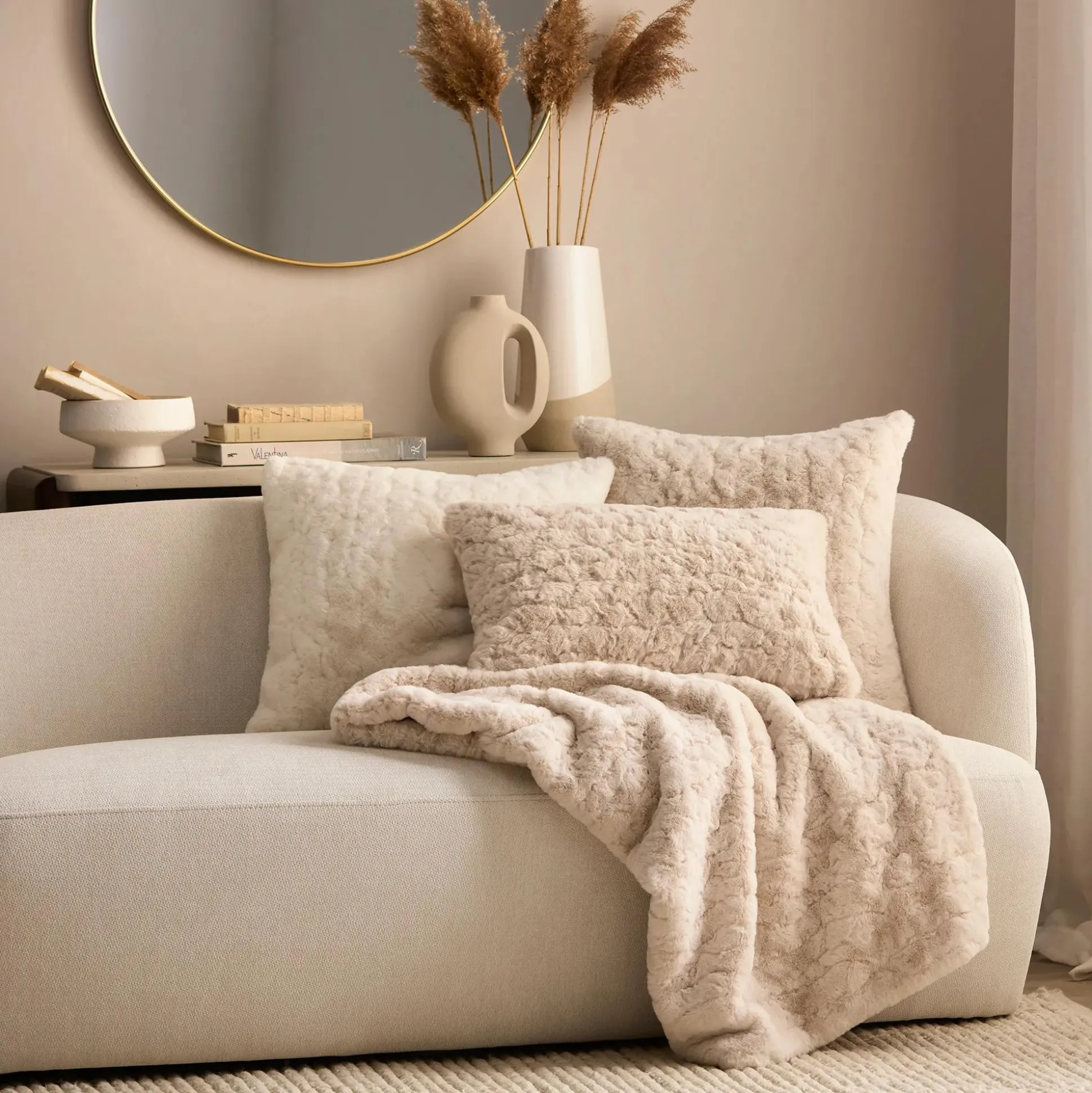Cozy up in style with this incredibly soft faux fur throw. Featuring a rich texture it has the look of a sheep’s coat and all the plushy goodness of fur. The perfect comfy touch in any room it’s ideal for snuggling for draping over a chair or at the foot of a bed for layered luxury. The only problem with this this Beige beauty is you might never want to get out from under it!