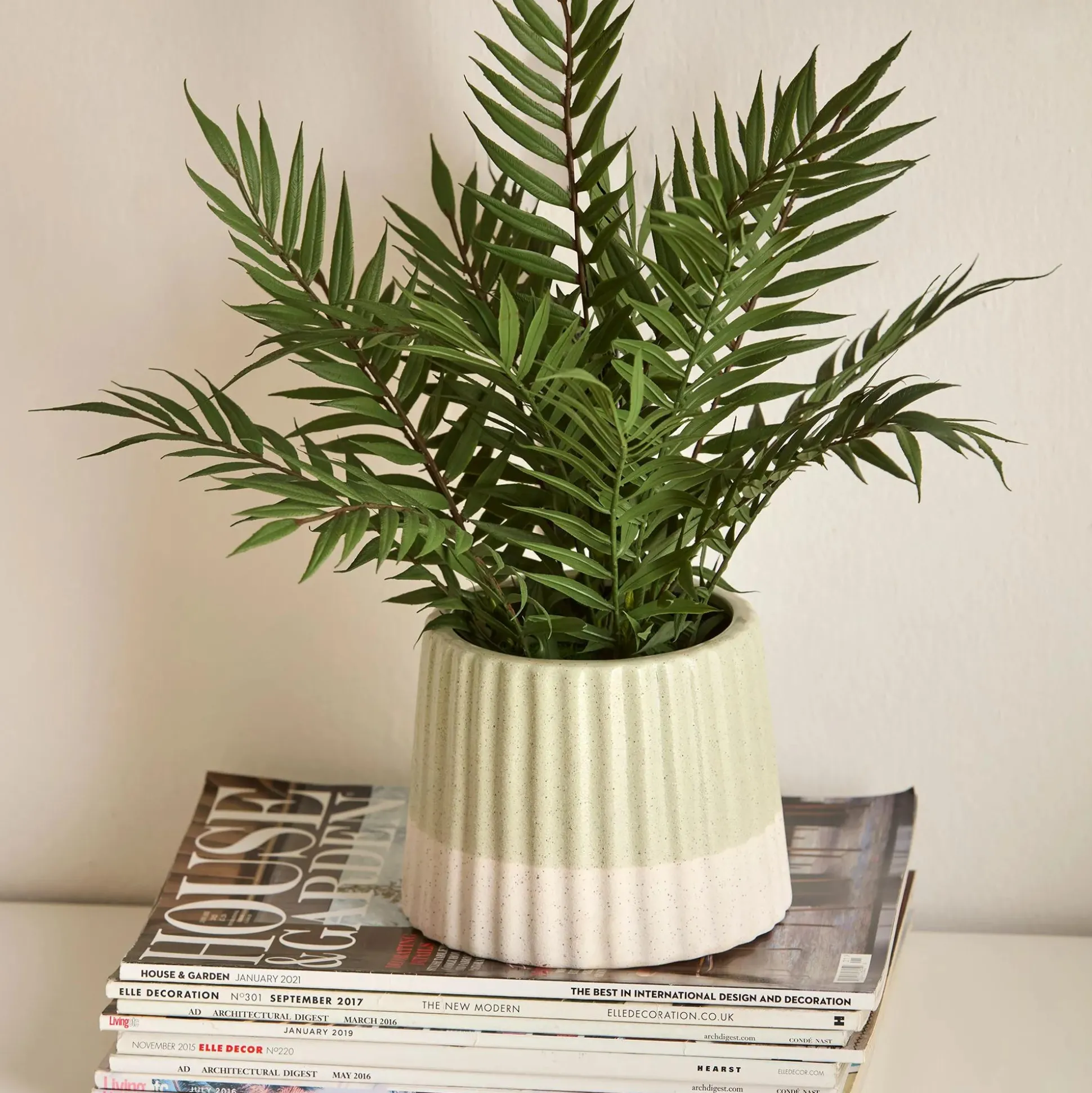 With its layered fronds and ribbed ceramic pot, this artificial fern brings the calm of the jungle without the upkeep. A leafy accent that feels alive.