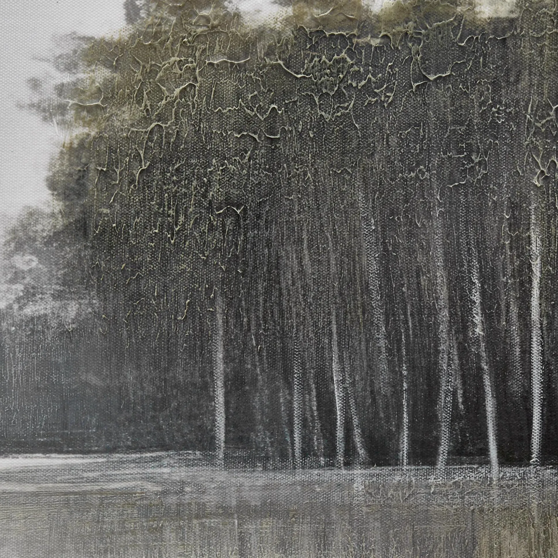 A hush over the water. This tranquil landscape blends soft light, muted trees, and still reflections. Framed in warm wood, it’s a moment of peace made to hang.