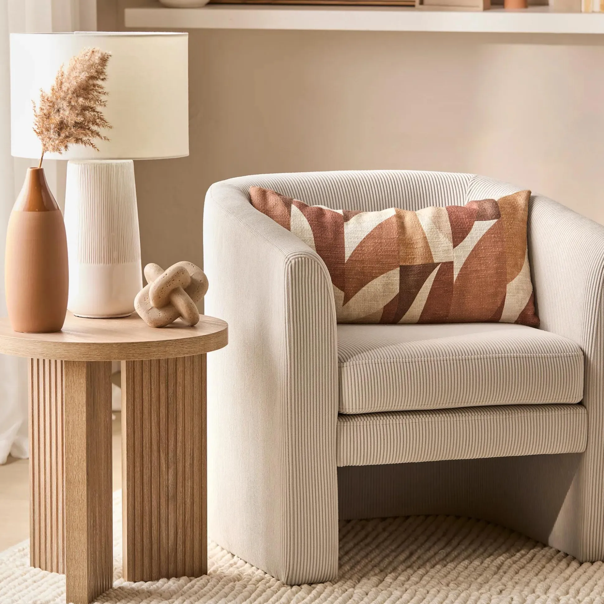 This round wooden side table beautifully combines warmth and simplicity, making it a perfect addition to any living space. The clean, minimalist design, paired with the natural wood structure, adds a touch of organic charm to your room. The spacious tabletop offers a practical surface while the subtle design ensures it complements a variety of interior styles.
